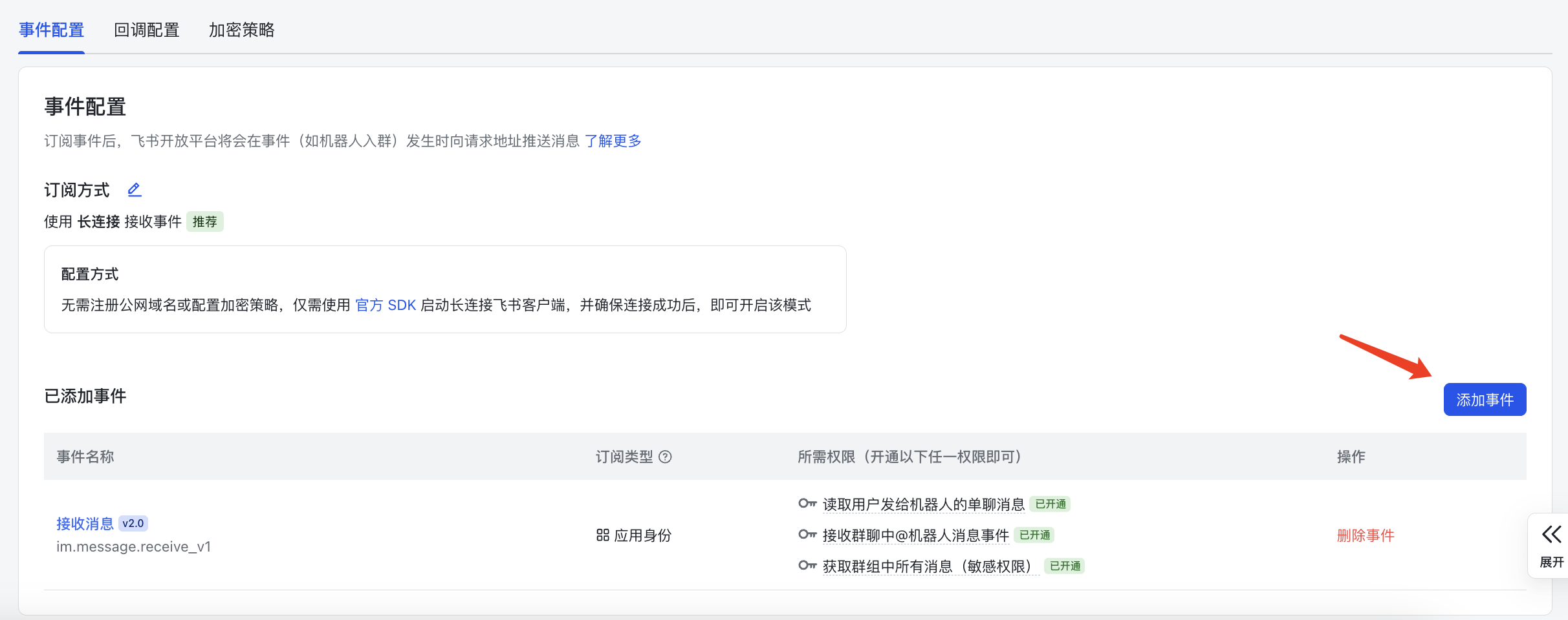 按照页面指引,确认开通「接收消息」相关权限,完成事件添加。