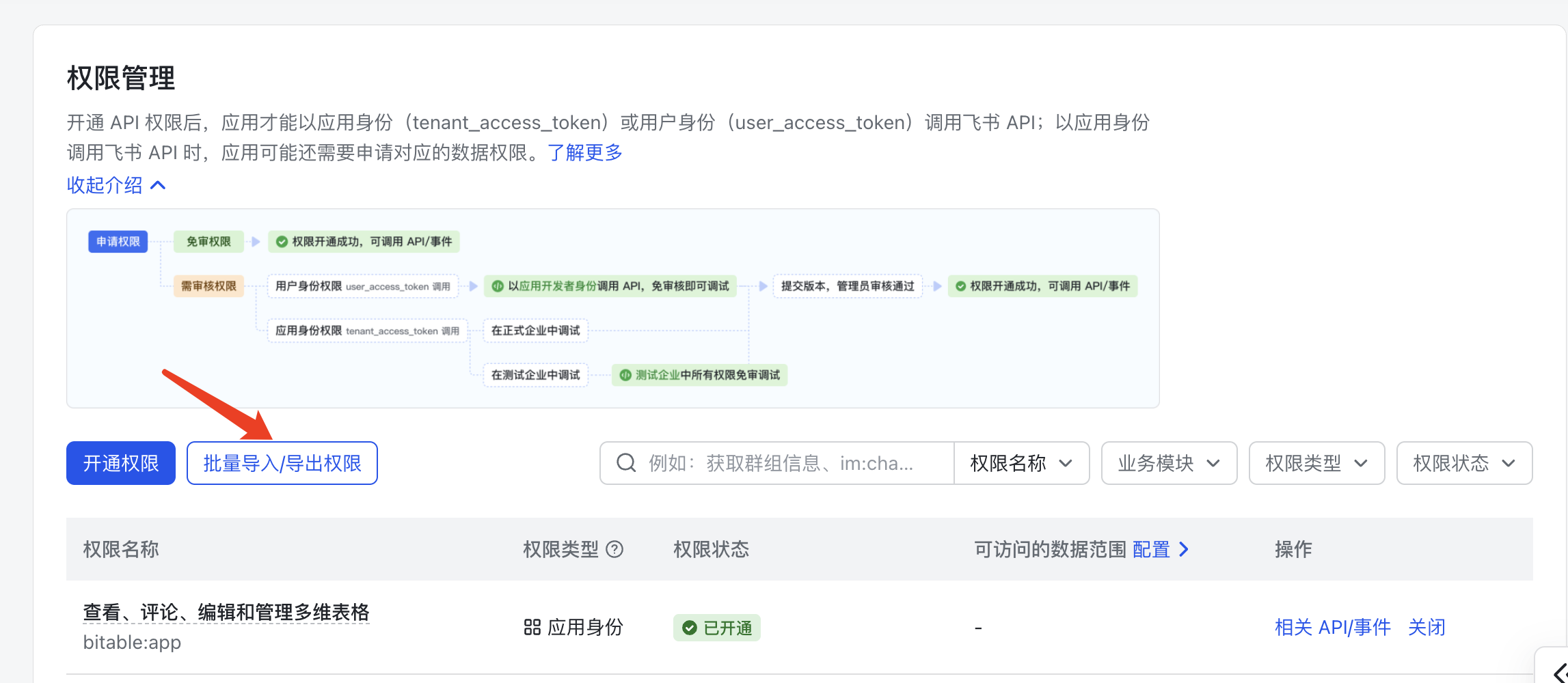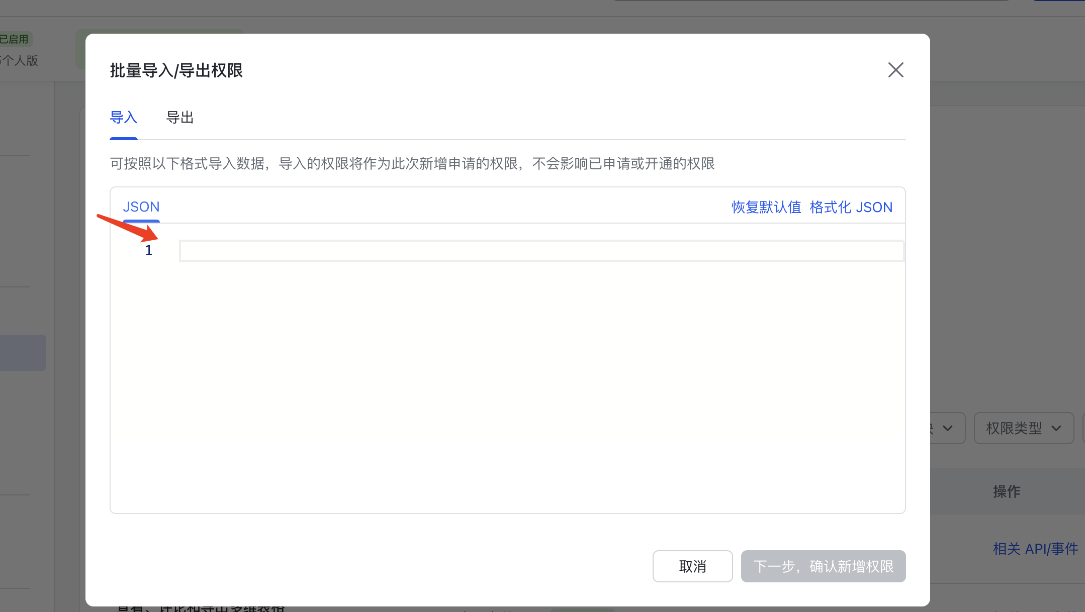 方式二:批量导入权限,点击页面中的「批量导入权限」按钮,弹出权限导入窗口,清空窗口原有内容,粘贴下方权限JSON代码,点击确认完成导入。