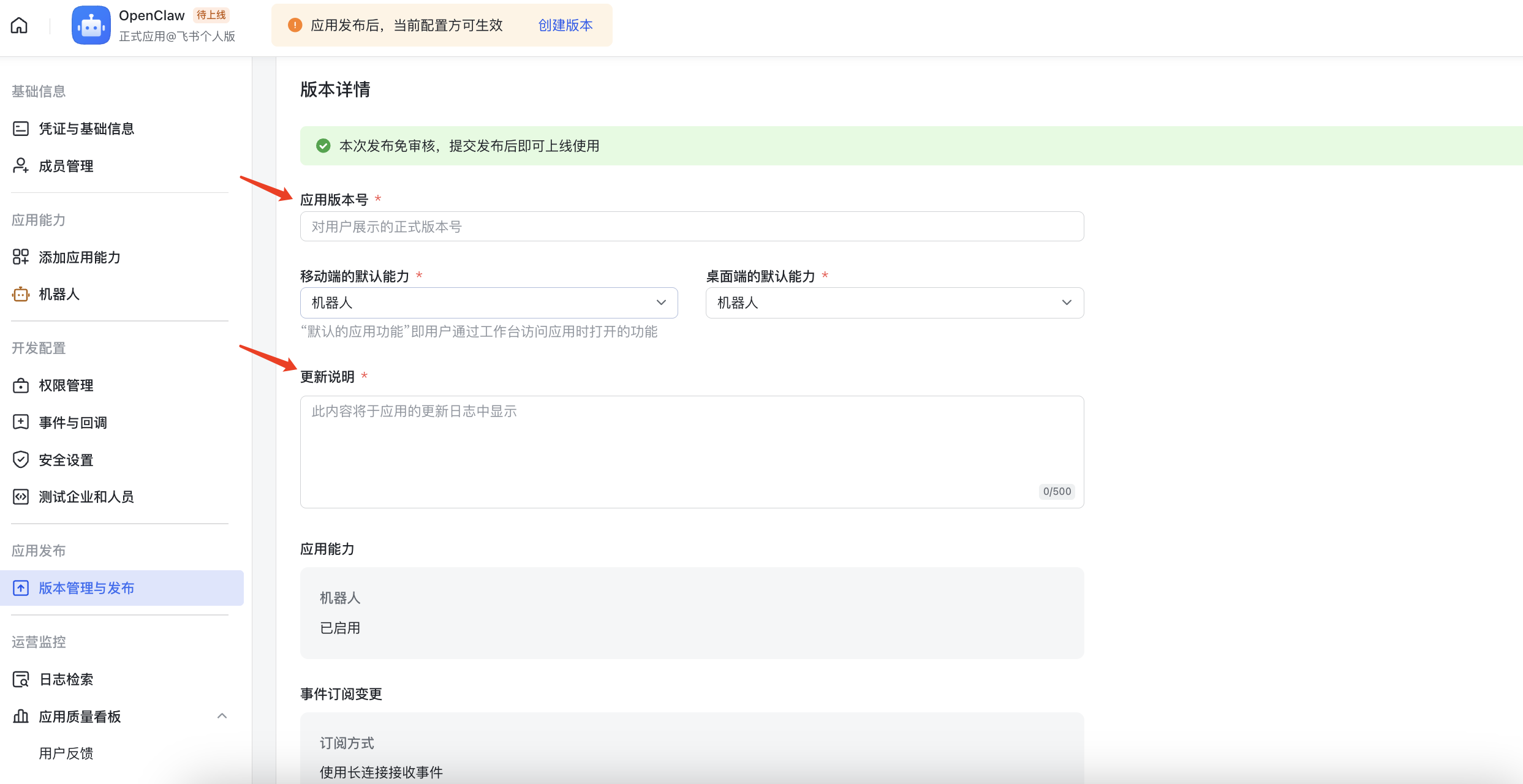 在飞书应用管理页面左侧导航栏,找到「版本管理与发布」,点击进入;