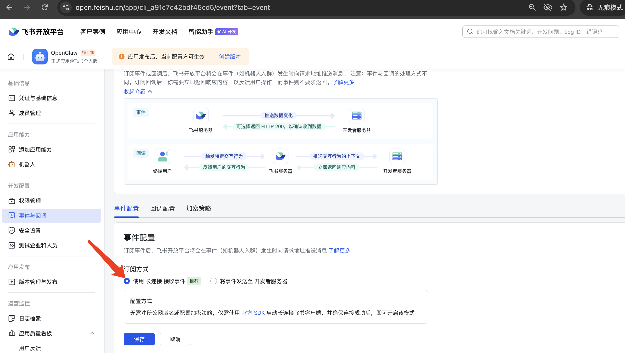 「订阅方式」选择「使用长连接接收回调」,点击「保存」按钮;