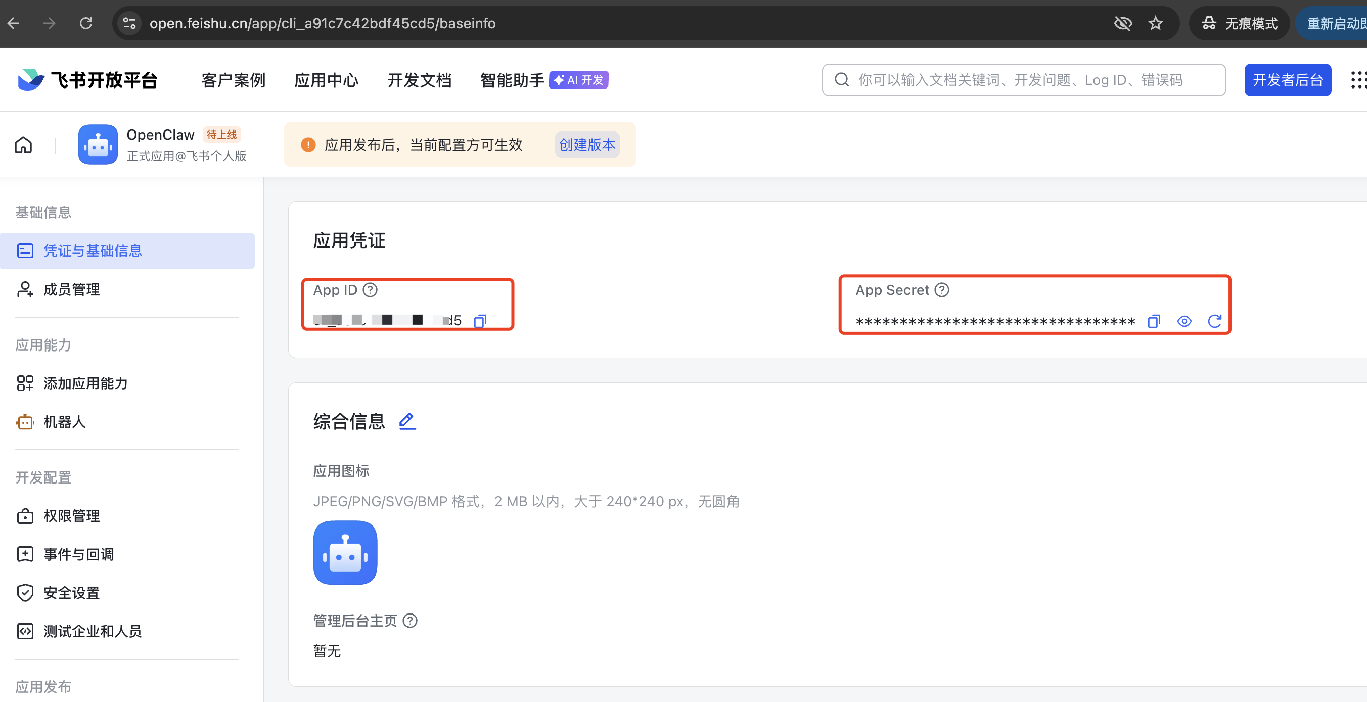 在应用管理页面左侧导航栏,找到「凭据与基础信息」,点击进入;