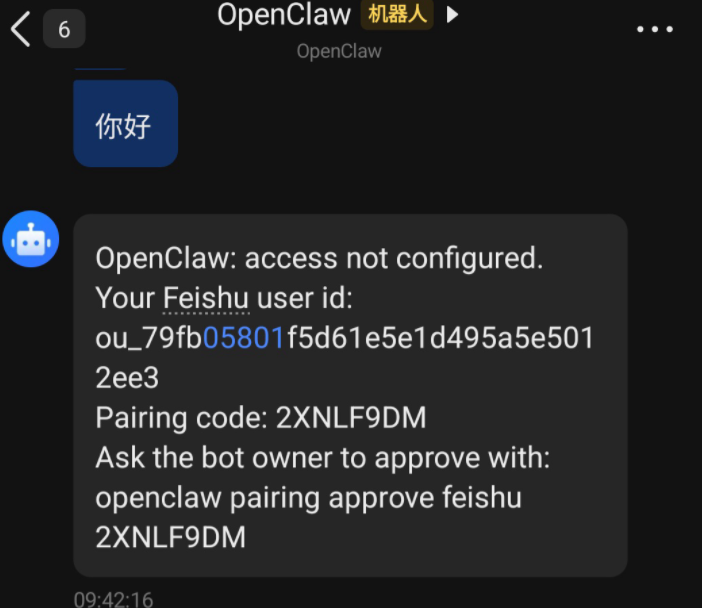 提示:首次与飞书机器人对话时,若提示配对请求,可按以下步骤完成配对: