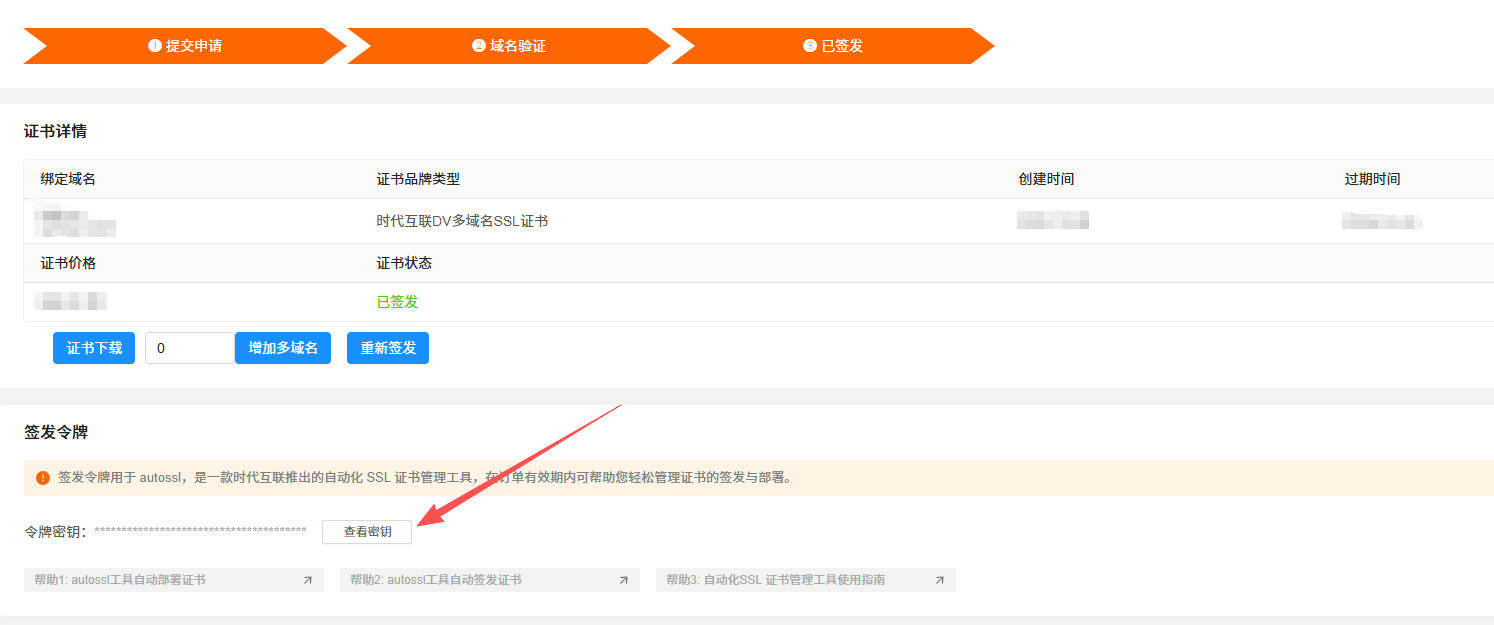 输入用户登录密码查看该证书的签发令牌,并复制。(后续autossl工具会以该令牌绑定证书)